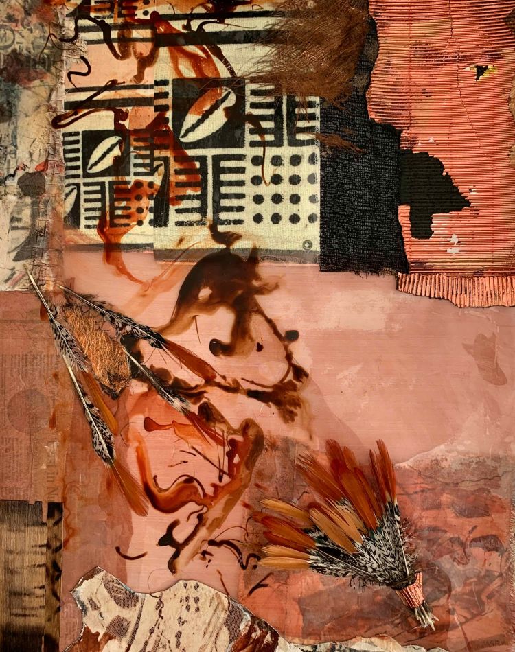 I wanted to create the textures and colors from Africa, so when I found this copy of Malian Bogolan fabric, and a previously painted piece of Mylar, the art developed quickly w/fibers, copper paper and the matching bird feathers.