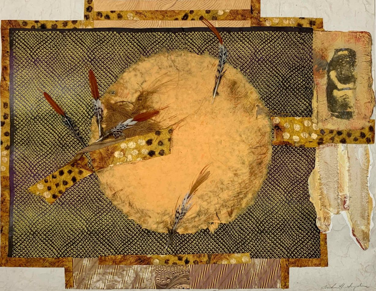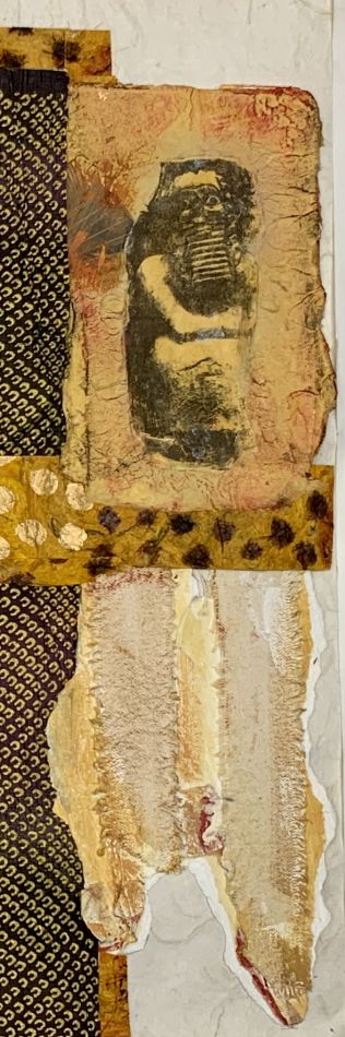 Mixed media, transfer of Sumerian statuette w/feathers, fibers, & handmade papers.