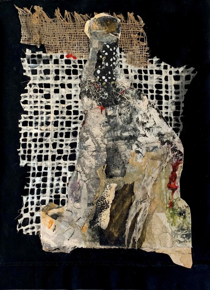 Abstract Figure From Cut-Up Collograph, Fiber w/Netted Paper on Black Canvas